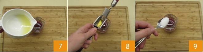 Transfira o suco para um recipiente, adicione o suco de 2 limas 7, esprema 1 raiz de gengibre descascada 8 e, por fim, adicione o açúcar. Misture tudo e deixe macerar por algumas horas 9.