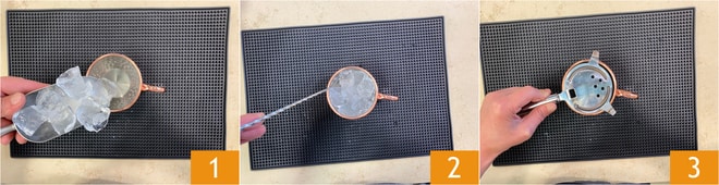 Para preparar o Moscow Mule, comece resfriando a caneca de cobre com gelo 1. Misture com a colher de bar apropriada 2, depois coloque o strainer sobre a caneca 3.