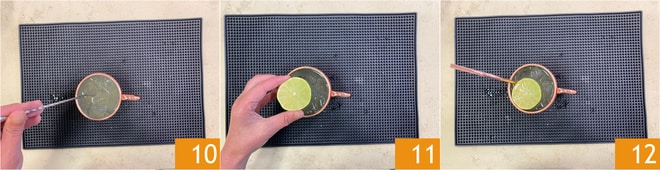 Com a colher de bar, misture de baixo para cima 10. Adicione meio limão no coquetel para reforçar o sabor da bebida 11. Pronto para servir um perfeito Moscow mule 12!