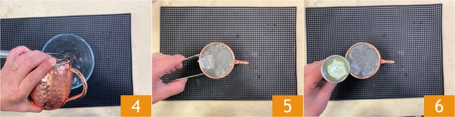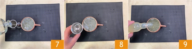 Despeje também a vodka no jigger 7, depois na caneca 8 e, por fim, a ginger beer, até 2 cm da borda diretamente na caneca 9.