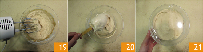 Quando estiver batido 19, adicione o merengue com uma espátula, pouco a pouco 20, até absorção completa. Sua mousse está pronta, cubra-a com filme plástico e deixe descansar na geladeira por 30 minutos 21.