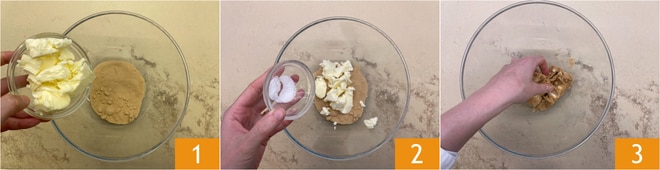 Para preparar a mousse de iogurte com gelée de cerejas e crumble, comece pelo crumble: em uma tigela, coloque o açúcar mascavo e a manteiga 1, adicione o sal 2 e misture 3.