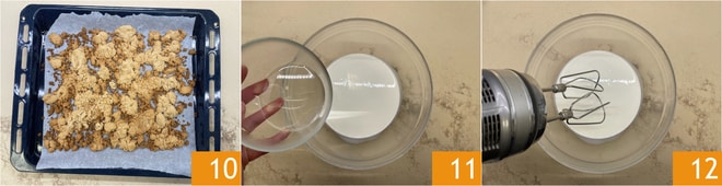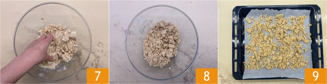 Você deve obter uma mistura grosseira 78. Distribua em uma assadeira forrada com papel manteiga 9 e asse a 170°C por 18 minutos em modo estático.