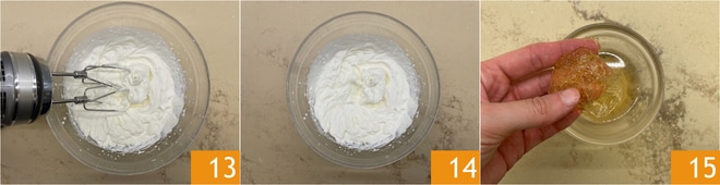 Você deve obter uma mistura semi-batida 13. Coloque na geladeira enquanto continua com a preparação 14. Derreta a gelatina amolecida e espremida no xarope de baunilha quente e mexa 15.