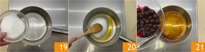 Prepare o gelée de cerejas: coloque o açúcar em uma panela 19 e derreta em fogo baixo, mexendo com uma colher 20 até obter o caramelo 20. Incorpore as cerejas 21.