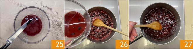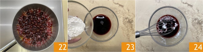 Deixe ferver sem mexer 22. À parte, dissolva o amido no vinho tinto 23 com um batedor 24.
