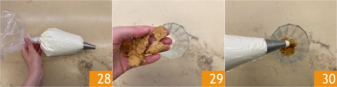 Coloque a mousse em um saco de confeitar 28. Monte os copos: no fundo, uma camada de crumble 29 e depois a mousse 30.