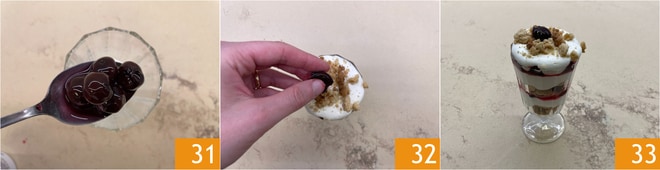 Continue com o gelée de cerejas e faça outra camada igual, complete com a mousse, o crumble e uma cereja 32. A sobremesa está pronta para ser servida 33.