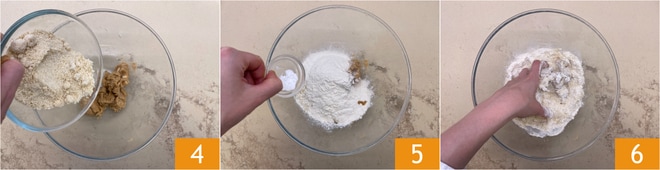 Adicione os ingredientes secos: a farinha de amêndoas 4, a farinha de trigo e o bicarbonato 5. Misture novamente com as mãos 6.