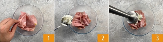 Para preparar a mousse de mortadela, coloque as fatias de mortadela em uma tigela 1, adicione o queijo ricota 2 e bata com o mixer de imersão 3.