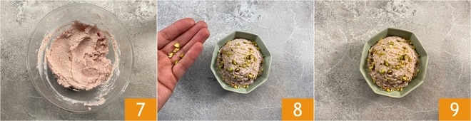 Você deve obter um creme liso e aveludado 7. Transfira a mousse para uma tigelinha e decore com pistaches picados 8. Acompanhe a mousse de mortadela 9 com torradas ou grissinis, ou use-a para rechear vol-au-vent!