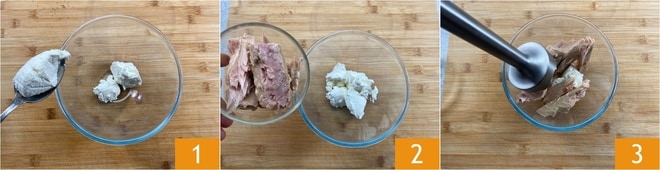 Para preparar a mousse de atum, a primeira coisa a fazer é colocar em uma tigela a ricota 1 e os filés de atum escorridos 2. Bata tudo com um mixer de mão até obter um creme 3.