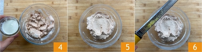 Nesse ponto, adicione o creme de leite 4 e bata novamente até obter uma consistência lisa 5. Adicione as raspas de limão 6.