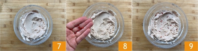 Misture novamente 7, depois adicione os grãos de pimenta rosa 8 e misture uma última vez 9. Cubra com plástico filme e guarde a mousse de atum na geladeira até o uso.
