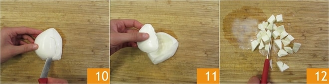 Agora, com a ajuda de uma faquinha, corte a parte central da mozzarella DOP criando um buraco em forma de cone 10. Extraia o pedaço de mozzarella 12 e corte em pequenos cubos 13