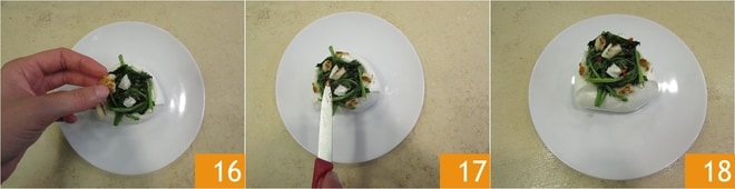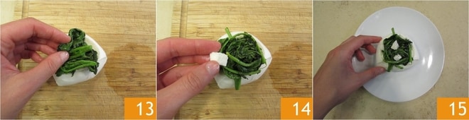 Recheie a mozzarella DOP com as folhas de nabo 13 e os cubos de mozzarella 14. Transfira para um prato de servir 15.