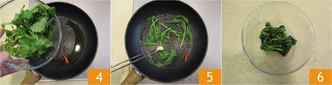 Adicione as folhas de nabo 4 e deixe murchar em fogo médio por cerca de 5 minutos 5. Adicione o sal, retire o alho e transfira para uma tigela 6, reservando a frigideira, que você usará para tostar o pão. Então, retire a pimenta e corte em fatias finas.