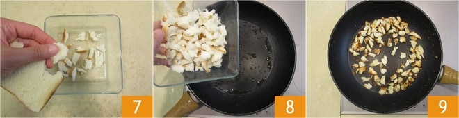 Despedace com os dedos o pão de forma em pequenos pedaços 7 e transfira para a frigideira onde cozinhou as folhas de nabo 8. Torre, mexendo de vez em quando com uma colher de pau para evitar queimar, e quando estiver bem dourado 9 desligue o fogo.