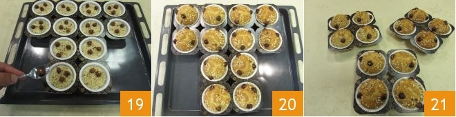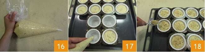 Transfira a mistura obtida para um saco de confeitar 16 e use-o para encher 12 forminhas 17. Decore com os pedacinhos de avelã 18,