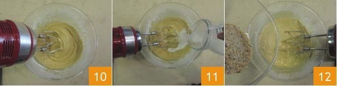 Quando estiverem completamente incorporados 10, despeje uma parte do leite 11, misture e adicione a farinha de avelã 12.