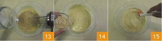 Despeje o restante do leite 13 e misture novamente com a batedeira. Em seguida, adicione os pedacinhos de avelã 14 e misture com uma espátula 15.