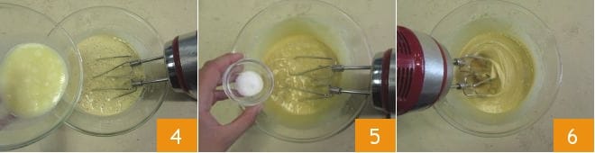 Em seguida, despeje a manteiga derretida 4, o sal 5 e misture novamente com as batedeiras 6.
