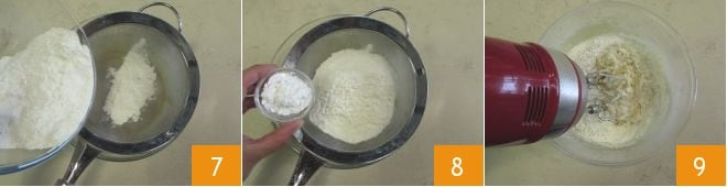 Peneire diretamente na tigela a farinha de trigo 7 e o fermento 8. Incorpore-os ao restante dos ingredientes sempre utilizando a batedeira elétrica 9.