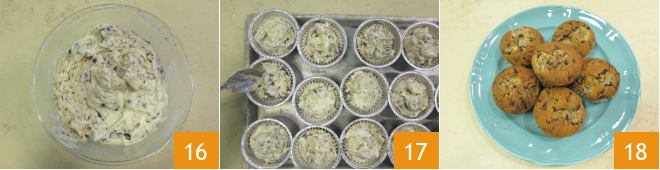 Agora que você preparou a massa 16, divida-a em 14 forminhas de alumínio com capacidade de cerca de 100 g cada 17. Asse em forno estático pré-aquecido a 180° por cerca de 25 minutos, posicionando a forma na prateleira inferior. Depois de assados, retire e sirva seus muffins de chocolate e pera 18!