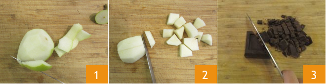 Para preparar os muffins de chocolate e pera, primeiro descasque as peras 1 e corte-as em pedaços 2, depois pique o chocolate com uma faca 3.