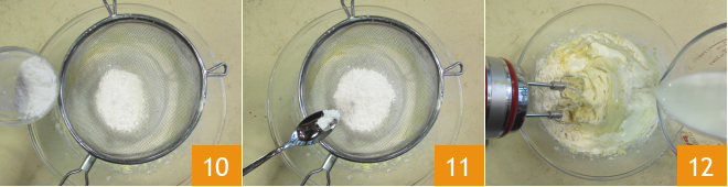Peneire também o fermento 10 e o bicarbonato de sódio 11 e continue batendo para incorporá-los à mistura. Por último, adicione o leite aos poucos, sempre mantendo a batedeira em ação 12.