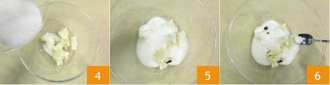 Coloque a manteiga amolecida e o açúcar em uma tigela grande 4, adicione o extrato de baunilha 5 e uma pitada de sal 6 e misture tudo com uma batedeira elétrica.