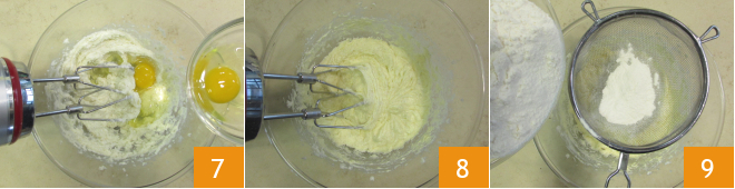 Quando a mistura estiver espumosa, adicione um ovo de cada vez 7 e continue batendo para incorporá-los completamente 8, depois adicione a farinha peneirando-a diretamente na tigela 9.