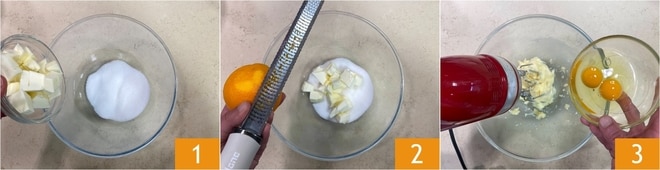 Para preparar os muffins de Halloween, coloque o açúcar em uma tigela e adicione a manteiga amolecida 1. Perfume com as raspas de laranja 2, depois comece a bater a mistura com uma batedeira elétrica, adicionando os ovos um a um 3.