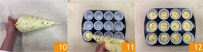 Transfira a mistura para um saco de confeitar descartável sem bico 10, assim você poderá fazer um trabalho mais preciso. Coloque as forminhas de papel em uma assadeira de 12 muffins e encha-as até dois terços 11, deixando cerca de um centímetro da borda 12.