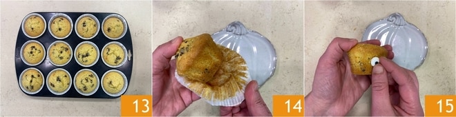 Asse em forno pré-aquecido a 180° por 18-20 minutos em modo estático. Retire do forno e deixe esfriar completamente 13. Neste ponto, seus muffins com gotas de chocolate estão prontos para serem decorados. Remova as forminhas de papel 14, depois aplique os olhinhos de açúcar 15.
