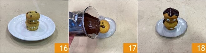 Empilhe os muffins em um pratinho 16 e prepare a cobertura: leve a água para ferver em uma panela. Desligue o fogo e coloque o pacote de cobertura de cacau por 7-8 minutos. Retire e seque bem o pacote antes de abri-lo. Despeje a cobertura em uma jarra, depois deixe-a escorrer sobre os bolinhos 17. Seus muffins de Halloween estão prontos para serem servidos 18!