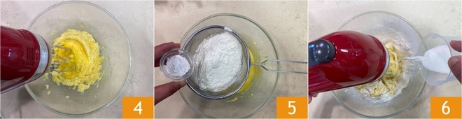 Trabalhe com a batedeira elétrica até obter uma mistura espumosa e clara 4. Agora peneire a farinha, o fermento em pó e o bicarbonato diretamente na tigela com a mistura 5. Adicione também a pitada de sal e ligue novamente a batedeira para incorporar os pós. Você notará que a massa ficará mais consistente, então dilua-a com o leite vertido em fio 6.