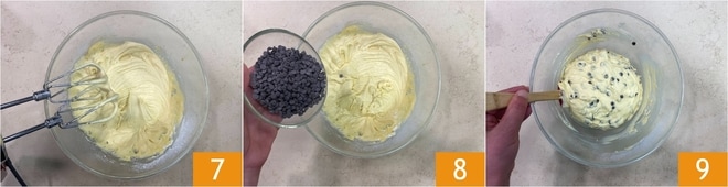Quando a mistura estiver macia e homogênea 7, adicione as gotas de chocolate 8 e misture com uma espátula para incorporá-las 9.