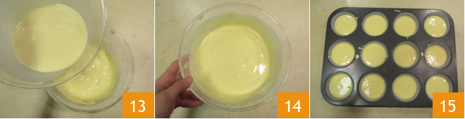 Agora, despeje tudo no restante da mistura de ovos, açúcar e farinha 13 e misture 14. Coloque forminhas de papel em uma forma de 12 muffins e preencha com a massa 15.