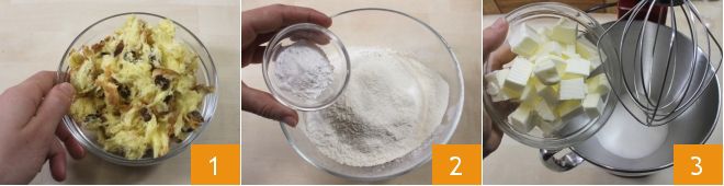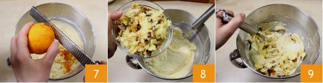 Quando os ingredientes estiverem bem misturados, adicione a casca ralada de uma laranja não tratada 7 e o panetone desfiado anteriormente 8, incorporando-o à mistura com uma espátula 9.