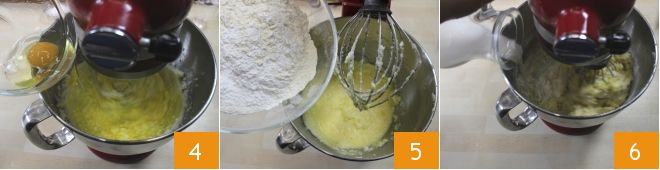 Adicione um a um os ovos 4, os ingredientes secos 5 e, por último, o leite em fio 6, continuando a bater.