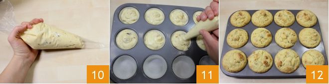 Transfira a mistura para um saco de confeitar 10, prepare uma forma de muffin com forminhas de papel e preencha-as até a borda 11. Asse em forno já aquecido a 180° por 25 minutos 12: os muffins de panetone estão prontos!