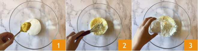 Para preparar os muffins macios de limão, misture todos os ingredientes em uma tigela. Em seguida, adicione o açúcar e a casca ralada de limão 1. Misture rapidamente com um batedor 2 e depois adicione a farinha 3,