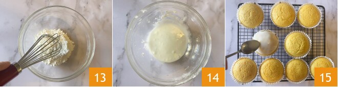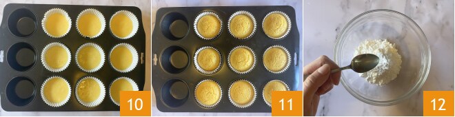 Seus muffins estão prontos para assar 10: em forno estático já aquecido a 180°C, por cerca de 20 minutos. Sempre faça o teste do palito para garantir, quando estiverem prontos, deixe-os esfriar 11. Em seguida, prepare a cobertura de limão: adicione o açúcar de confeiteiro e o suco de limão aos poucos 12.