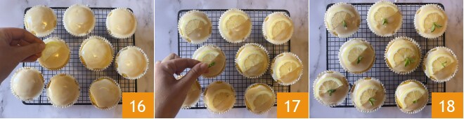 e decore cada um com meia fatia de limão 16 e uma folhinha de hortelã fresca 17. Aqui estão os seus muffins macios de limão prontos 18!