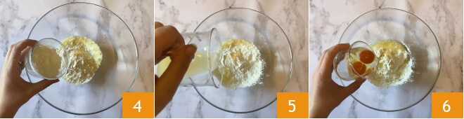 o amido de milho 4, o fermento em pó, leite, óleo e suco de limão 5, depois os ovos 6.