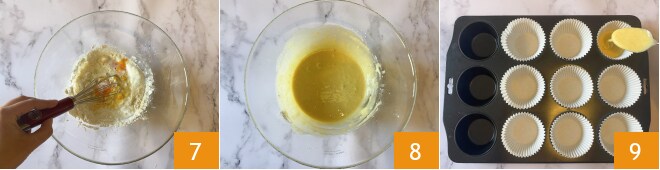 Misture tudo 7 até obter uma massa lisa e homogênea 8. Despeje-a em 9 forminhas de papel, dispostas em uma forma de muffin, preenchendo até 3/4 (cerca de 3 colheres de sopa por forminha) 9.