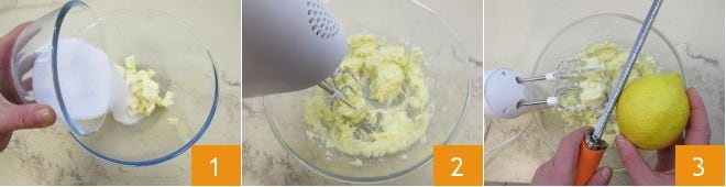 Para preparar os muffins de cacau mesclados com gotas de chocolate branco, primeiro coloque as gotas de chocolate branco em uma bandeja e depois leve ao freezer para congelar. Em uma tigela, coloque a manteiga amolecida em pedaços e adicione o açúcar 1, trabalhe a mistura com a batedeira elétrica 2, depois aromatize com a casca ralada de 1 limão não tratado 3 e uma pitada de sal, continue trabalhando até que fique cremoso.