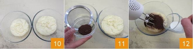 Divida a massa em duas tigelas 10, em uma adicione o cacau peneirado 11 e 30 g de leite 12, para que tenha a mesma consistência da clara e um resultado semelhante na cocção;