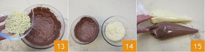finalmente, adicione as gotas de chocolate branco previamente congeladas e enfarinhadas 13. Assim, você obterá duas massas bicolores 14, Misture para homogeneizar a mistura. Transfira as massas para dois sacos de confeitar descartáveis sem bico 15,